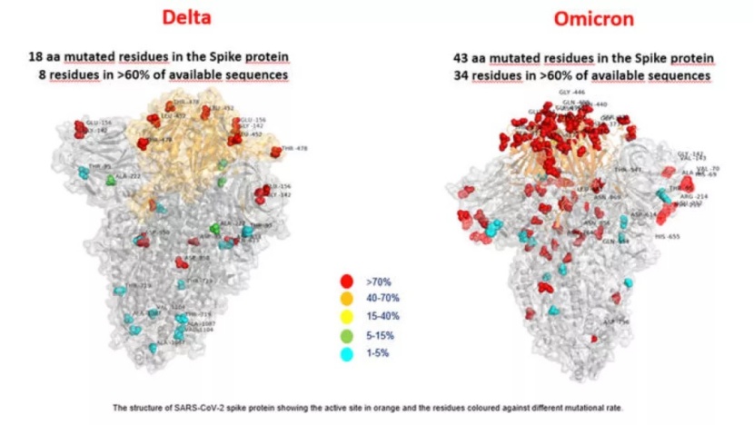 The images show that the Omicron strain possesses more stinging protein mutations than the new coronavirus delta strain. These mutations are diverse and mostly located in regions that interact with human cells.
